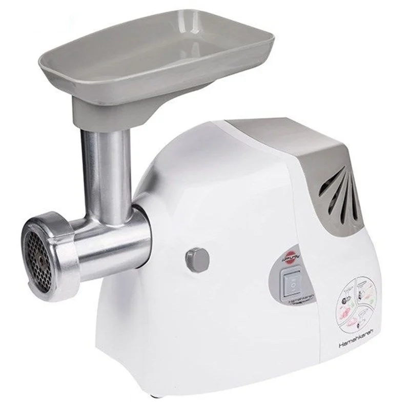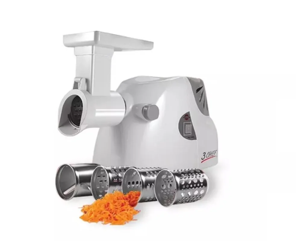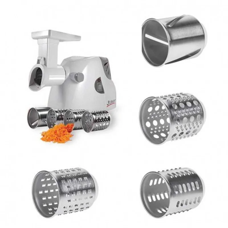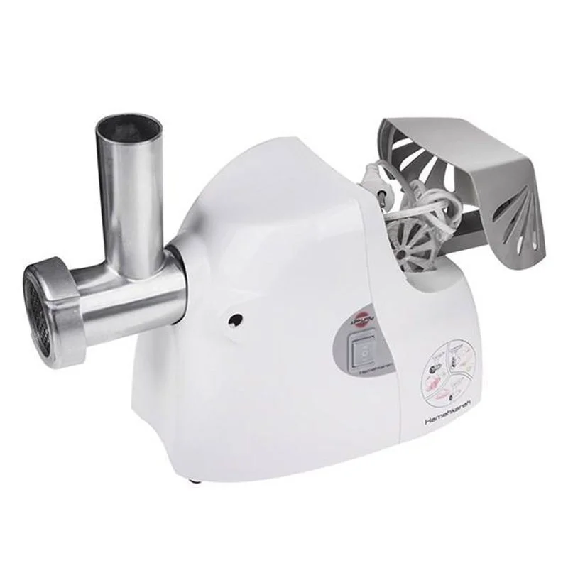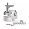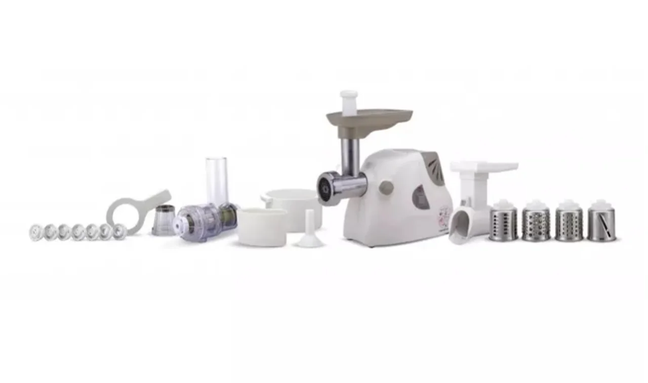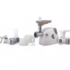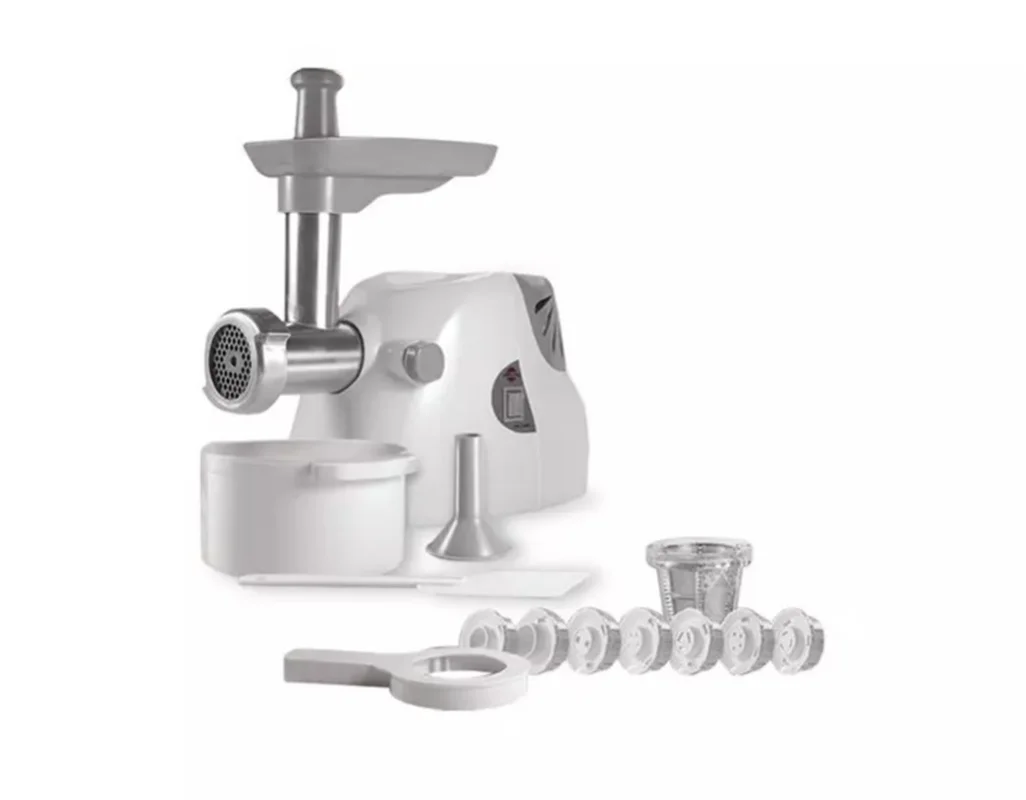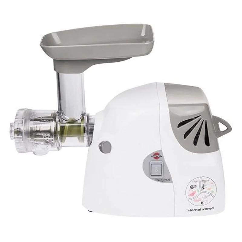 چرخ گوشت: خروجي 1200 گرم گوشت در دقيقه، مجهز به كليد برگردان (Reverse) (براي برگرداندن مواد غذايي باقيمانده در دستگاه بدون نياز به باز كردن چرخ گوشت)، دو عدد شبكه مخصوص گوشت چرخ كرده، قيمه و سبزي، قطعه سوسيس ساز، ظرف پلاستيكي جهت جمعآوري گوشت چرخ شده، محفظه نگهداري سيم و شبكه